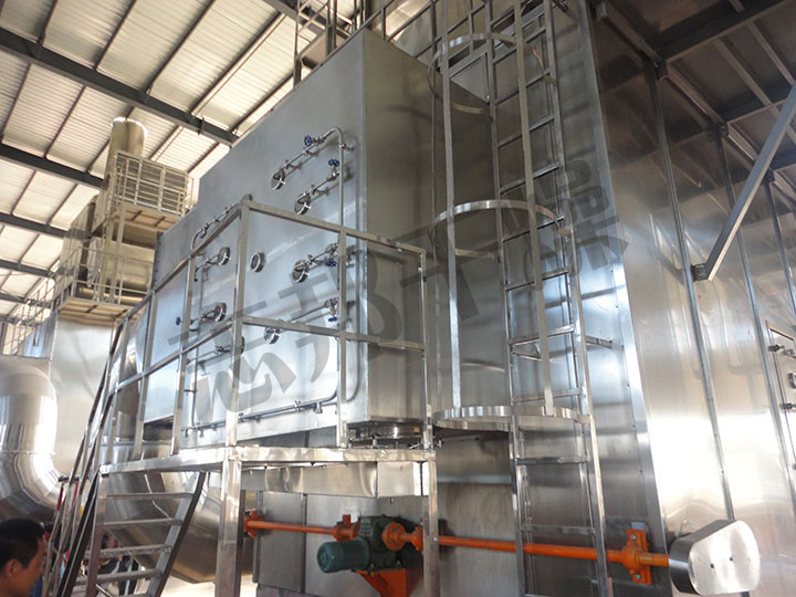 卧式喷雾干燥机可使溶液、乳浊液、悬浮液、糊状液等物料,经喷雾干燥成为干燥粉末状、细中颗粒的制品。其工作原理如下:空气通过过滤器和加热装置后,进入干燥室顶部的热风分配器,通过热风分配器的热空气均匀地进入干燥室,并成螺旋状流动,同时将料液送到安装在干燥室顶部的离心喷雾头,料液被雾化成小的雾状液滴,使料液和热空气接触的表面积大大增加,水分迅速蒸发,在短的时间内形成干燥成品。
